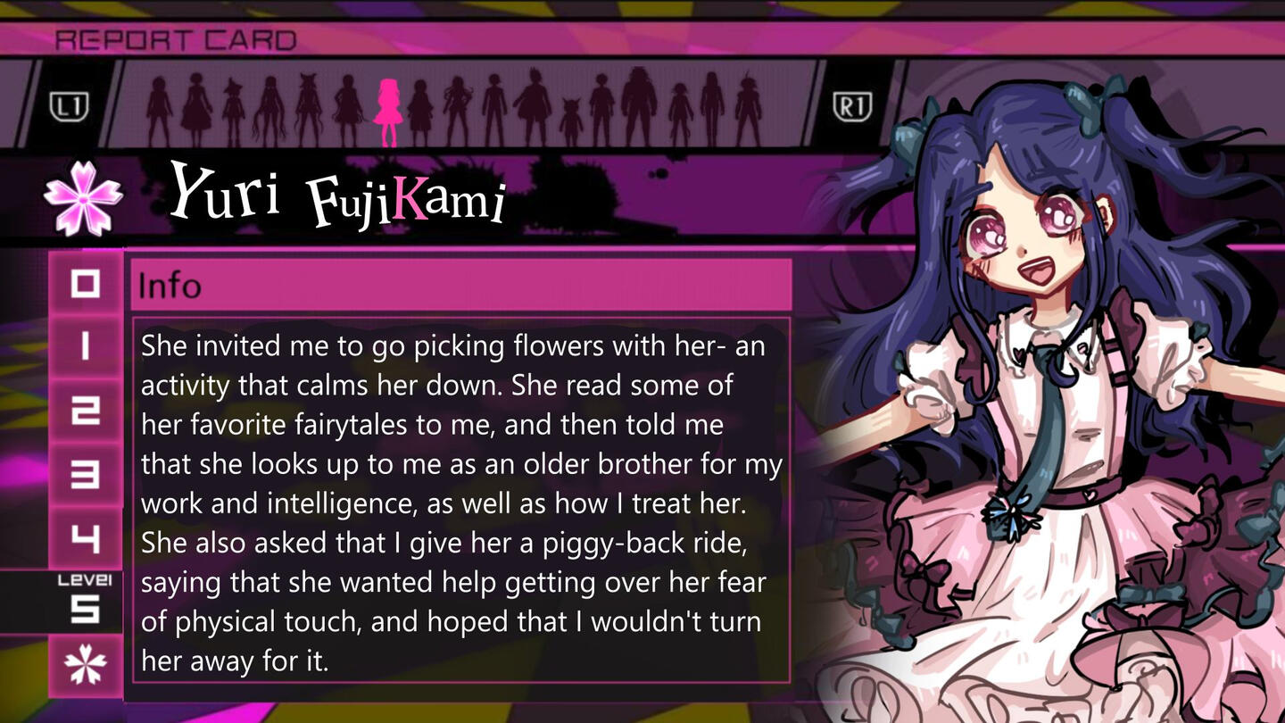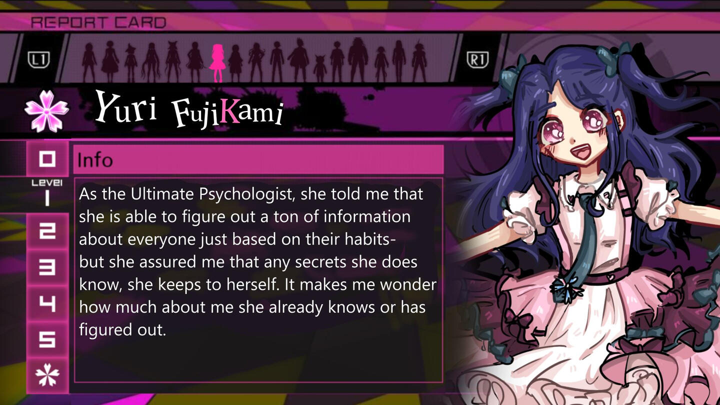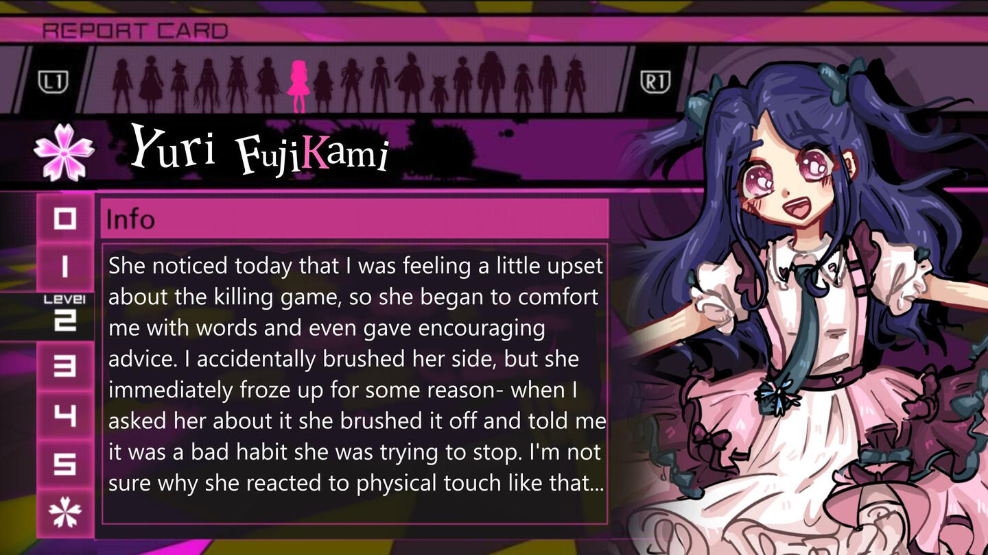 After Yuri's near-death experience with Korekiyo, she became a lot less naive and a lot more wary about the people around her. She still treated people with love and kindness, but deep down, she was analyzing far more often than she had been before, and was starting to accept that some people could still have ill intentions. She started putting her psychology to good use.
