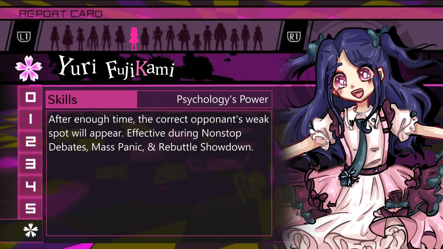 Yuri's naivety gets in the way of using her Psychology to her advantage during the first half of the Killing Game. Though she receives many hints about the blackened and mastermind, she denies them, not believing her friends could do any harm. She struggles to overcome this.