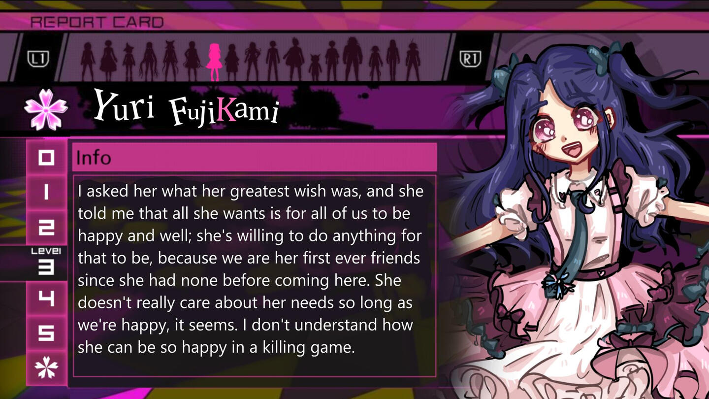 Yuri was accepted, partially for being famous, but also out of curiosity. The DGRP team was very curious as to how a girl with a 'perfect' life could be so unhappy as to wanting to join a Killing Game.